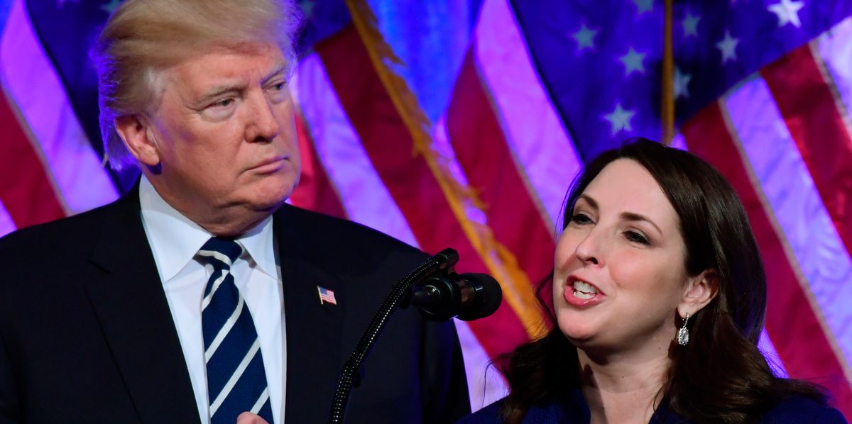 في هذه الصورة الأرشيفية، تتحدث رئيسة اللجنة الوطنية للحزب الجمهوري رونا مكدانيل في حفل لجمع التبرعات مع الرئيس السابق دونالد ترامب.