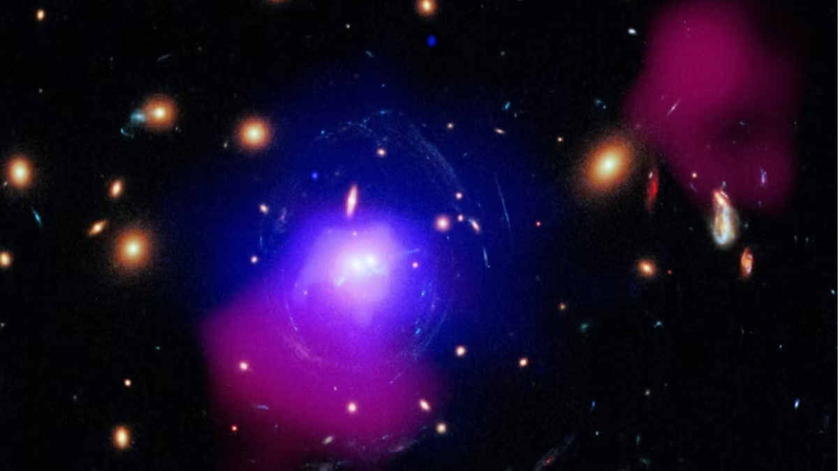 تزين القلادة المرصعة بالنجوم مجموعة ضخمة مكونة من مئات المجرات تسمى SDSS J1531؛ يقع هذا الجسم على بعد حوالي 3.8 مليار سنة ضوئية من الأرض. يستضيف العنقود المجري أيضًا خزانًا كبيرًا من الغاز الساخن، وفي قلبه، هناك اثنتان من أكبر المجرات في طور الاندماج في مجرة واحدة. من المحتمل أن الانفجارات التي التقطها العلماء قد نشأت من ثقب أسود هائل في إحدى تلك المجرات المتصادمة.