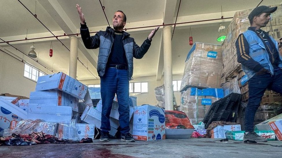 وأظهرت صور ما بعد الحادث بركة من الدماء في فناء خارج مستودع مطلي باللونين الأزرق والأبيض، وبركة أخرى داخل مدخل المبنى بجوار صناديق المساعدات.