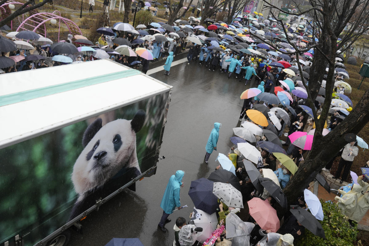 وفي يوم الأربعاء، تحدى العديد من محبي الباندا في كوريا الجنوبية المطر لحضور حفل وداع في حديقة إيفرلاند لفو باو، الذي كان من المقرر أن يسافر جوا إلى الصين في وقت لاحق من اليوم.