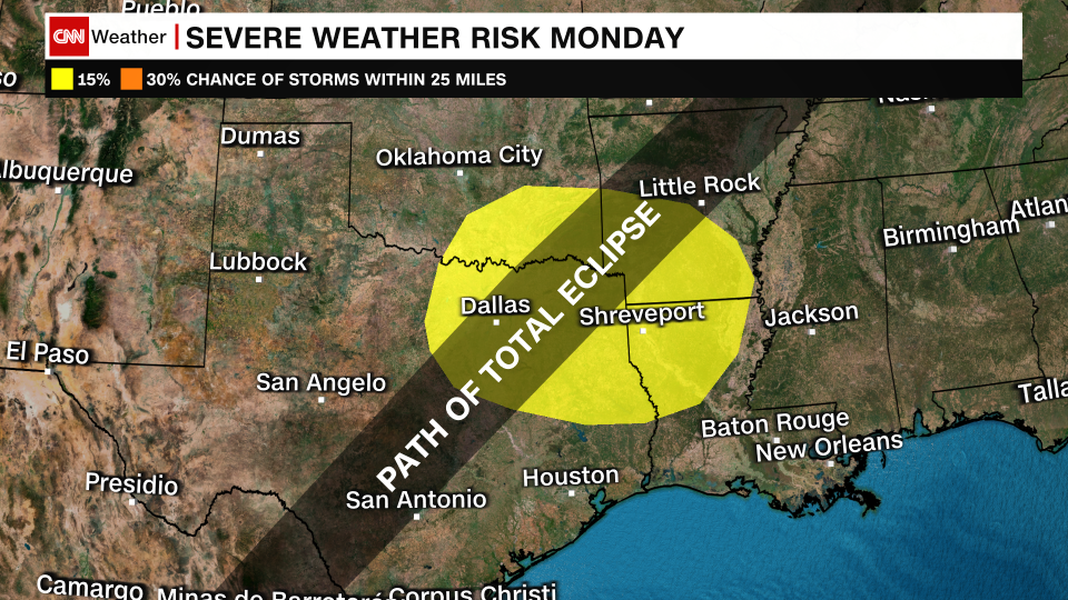 ويتقاطع خطر الطقس الشديد مع جزء كبير من مسار الكسوف الكلي في الجنوب. قد تؤدي أي سحب قبل العواصف إلى حجب الرؤية بالنسبة للبعض، ولكن من المرجح أن تجلب العواصف مخاطر للمسافرين بعد الكسوف.