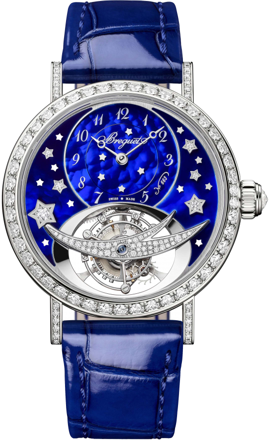 أضافت Breguet ساعتين جديدتين 3358 إلى مجموعةClassique Tourbillon . تم ابتكار هذه الساعة من الذهب الأبيض ليغمرنا في أحلام الليالي المرصّعة بالنجوم. ويبدو أن وابلاً من الماس ينساب فوق مينائها المصنوع من عِرق اللؤلؤ والمطلي باللون الأزرق الداكن. ولإضفاء المزيد من العمق، تزيّن مجموعة من النجوم الذهبية الميناء: مصقولة وبعضها مزيّن بالماس. تعكس حلقة الفصل المنحرفة عن المركز عند موضع الساعة 12 الحمض النووي للعلامة التجارية مع أرقام عربية وعقارب Breguet ذهبية مطليّة بالروديوم، بينما يظهر الرقم التسلسلي عند موضع الساعة 4.