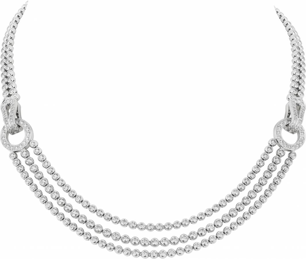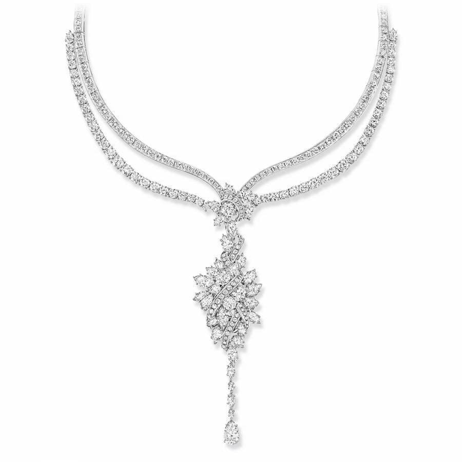 عقد Agrafe Mariage من Cartier مصنوع من الذهب الأبيض ومرصّع بـ 330 ماسة ذات قَطْع بريانت يبلغ مجموعها 12.53 قيراطاً. تصميم مميز يليق بفستان الزفاف المفتوح عند الياقة ويضفي مزيداً من السحر على إطلالة العروس.