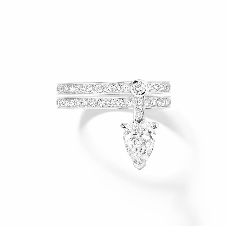 خاتم من مجموعة Serti Sur Vide من Repossi يعكس إعادة تفسير مذهلة للسوليتير، مع حلقة مرصوفة وماسة عائمة. تصميم مميز مصنوع من الذهب الأبيض ومرصّع بحبيبات من الماس الفاخر المرصوفة بشكل جميل على طول الخاتمين الموجودين.