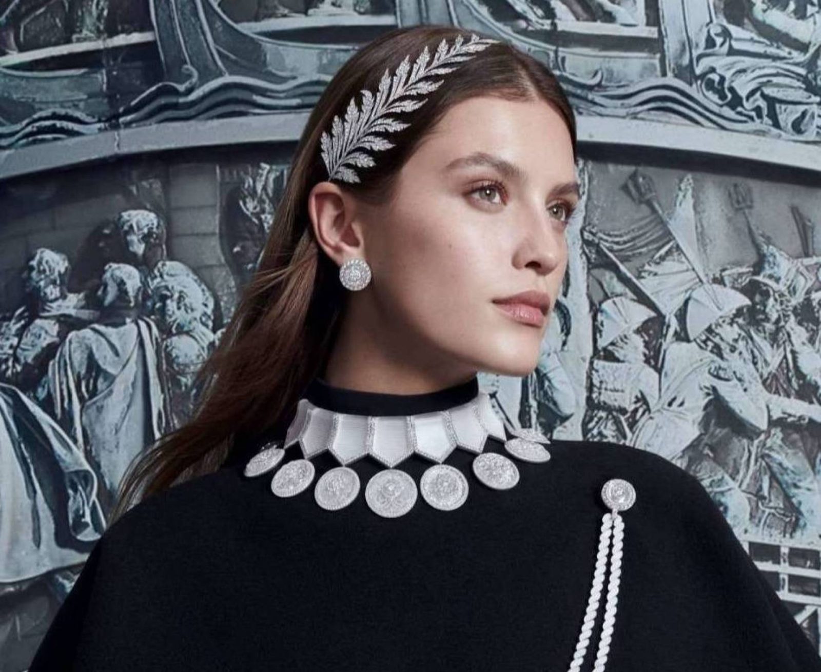 أقراط من مجموعة Power of Couture من Boucheron ذات تقنية زخرفية تتمثل في إنشاء تصميم على القماش عبر تطريزه بخيوط من القطن أو الحرير أو الذهب باستخدام إبرة أو خطاف. تمت استعارة تطريزات الفروع من الملابس الاحتفالية لتأخذ شكل السرخس، وهو نبات كان Frédéric Boucheron يعشقه. هذا التصميم مرصوف بالكامل بالماس في إطار من الذهب الأبيض.