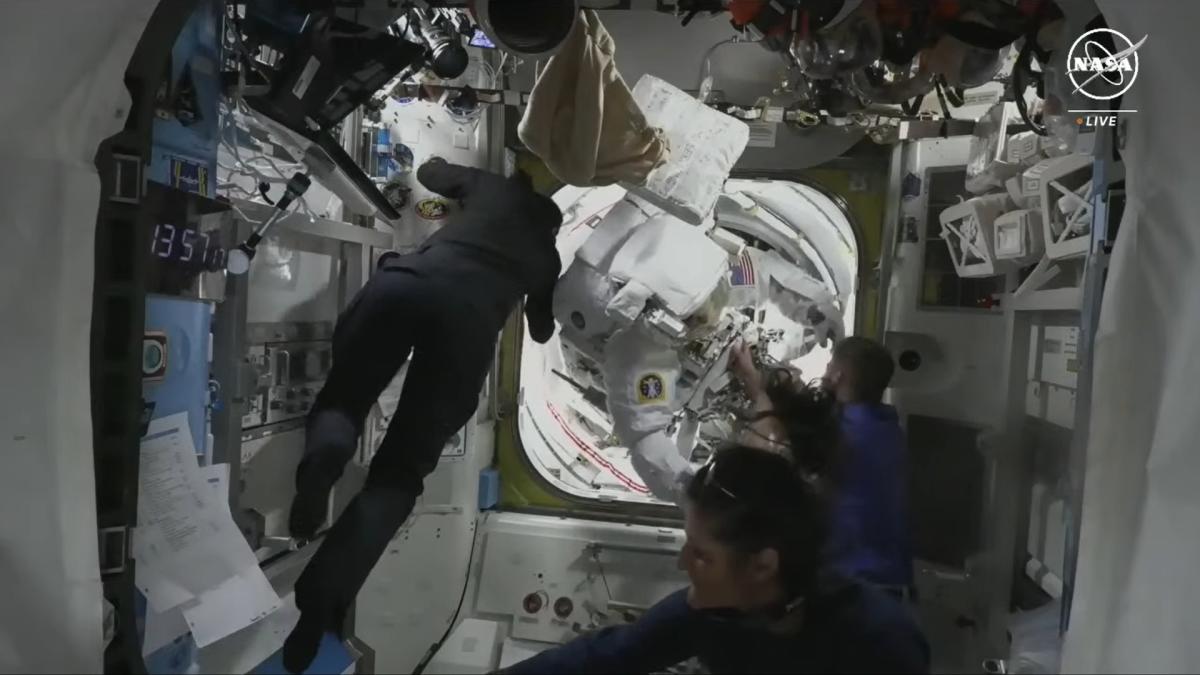 كانت الظروف فاترة داخل الفتحة أثناء إعادة الضغط. وقال دايسون: “الطقس ثلجي قليلاً هنا، لكنه ليس سيئاً كما كان… لا يزال لدي جليد على قفازاتي وعلى خوذتي قليلاً”.
