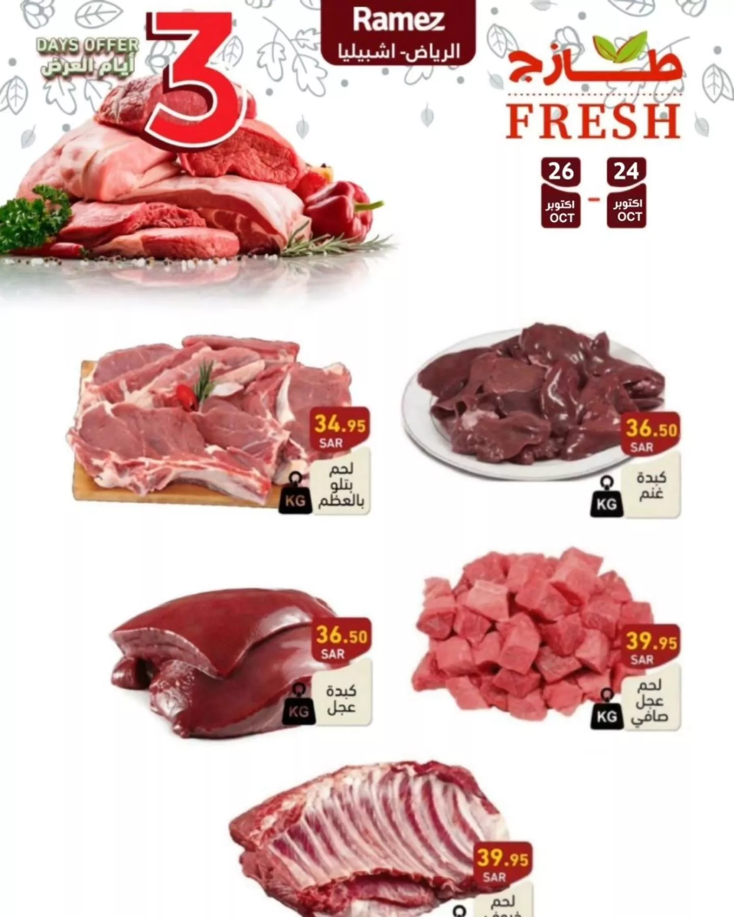 تشمل عروض أسواق رامز السعودية لحوم طازجة بأفضل الأسعار بالإضافة إلى مجموعة مختارة من الأجبان والزيتون والخضروات مما يتيح للعملاء الحصول على احتياجاتهم اليومية بأعلى جودة وأقل تكلفة.