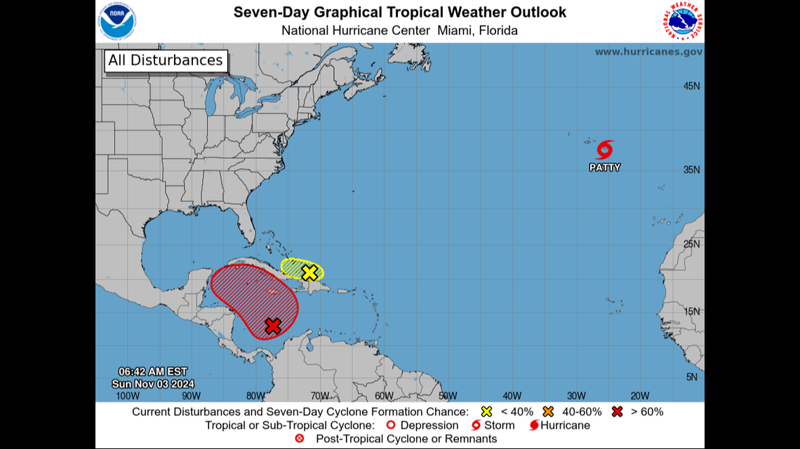 ويوصف هذا الاضطراب بأنه “منطقة واسعة من الضغط المنخفض فوق جنوب غرب البحر الكاريبي” ويمنح فرصة تشكل بنسبة 80% في اليومين المقبلين و90% في الأيام السبعة المقبلة.