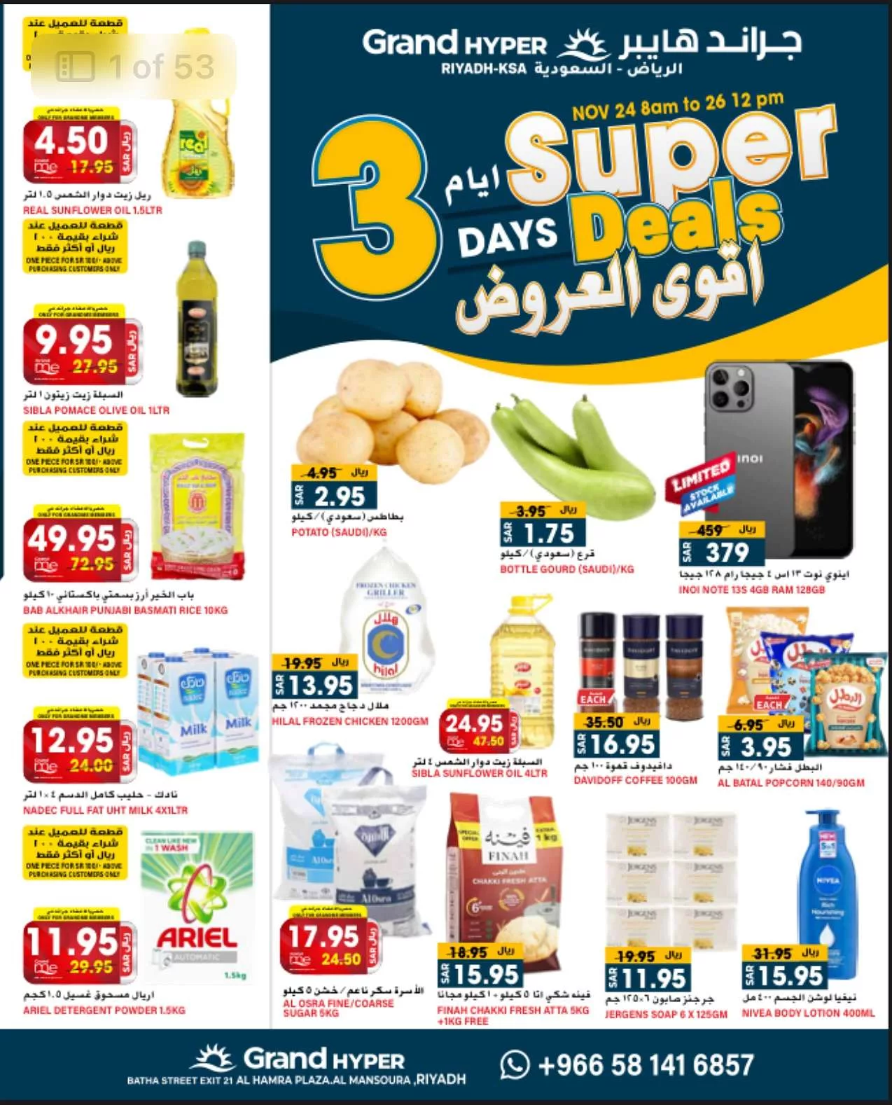 عروض جراند هايبر الرياض الاحد 24-11-2024 يقدم مجموعة مذهلة من العروض على مختلف المنتجات الغذائية والمشروبات واللحوم مع تخفيضات خاصة على الفواكه والخضروات الطازجة التي تشمل البرتقال و التفاح و الموز وغيرها من المنتجات الطازجة المستوردة والمحلية باقل الاسعار