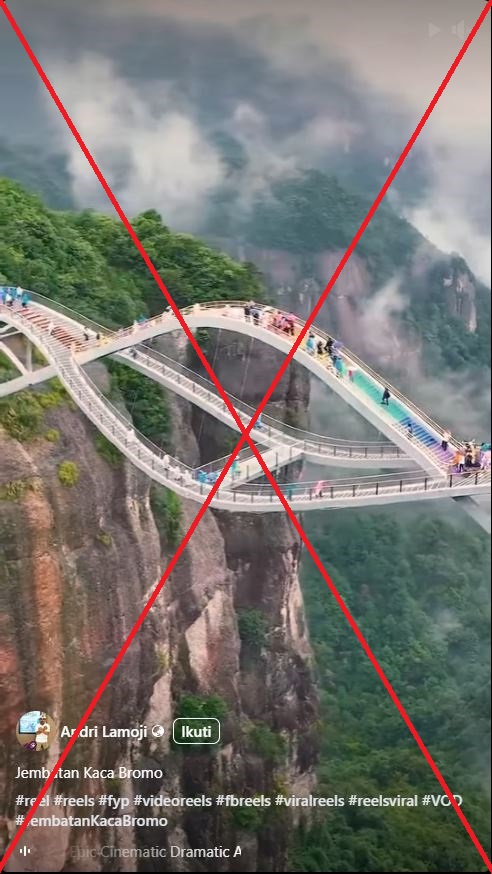 بعد افتتاح جسر سياحي زجاجي مميز بدخول محدود في إندونيسيا، انتشر مقطع فيديو على الإنترنت مع ادعاء كاذب أنه يظهر عامل الجذب الجديد. ومع ذلك، يظهر المقطع في الواقع “الجسر المنحني” الذي تم افتتاحه في الصين في سبتمبر 2020، والذي يتميز بتصميم مختلف عن الجسر في إندونيسيا.
