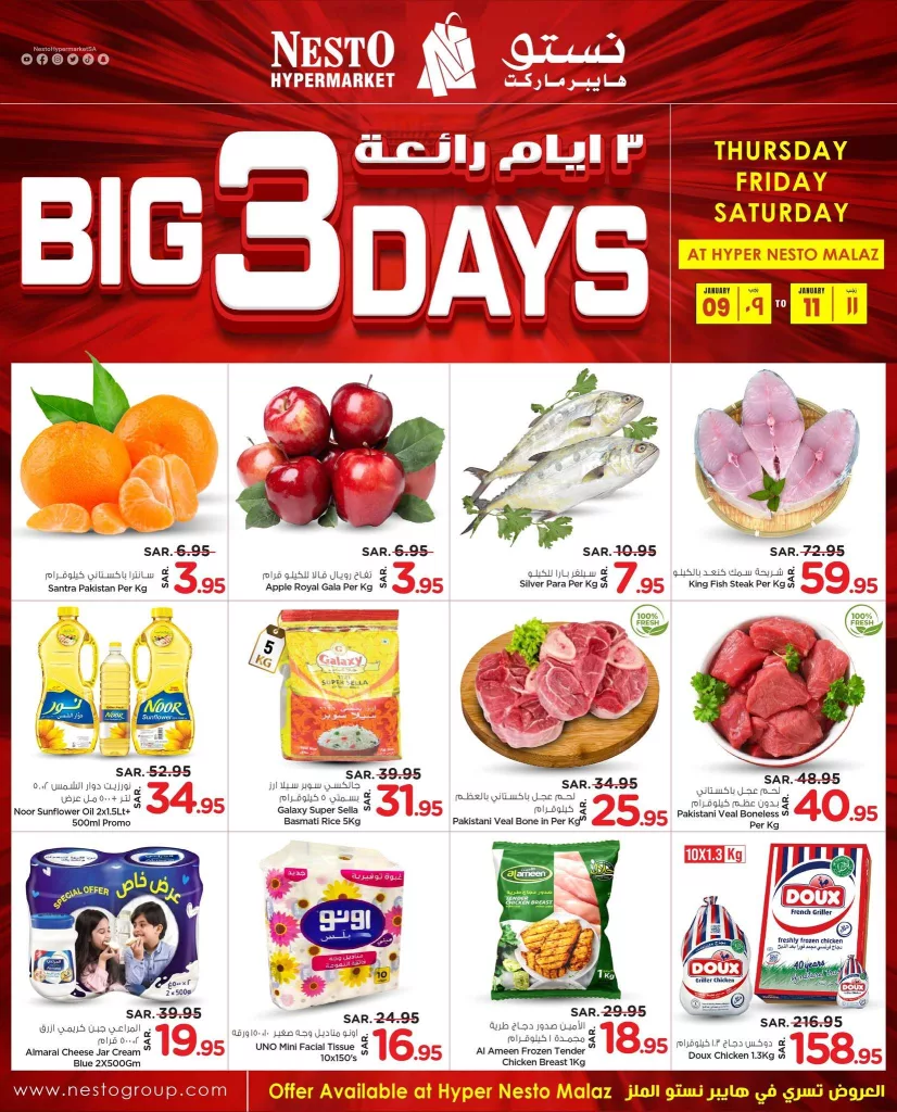 عروض نستو الملز الخميس 9 يناير 2025 تقدم خصومات هائلة على المنتجات الغذائية الأساسية مثل الأرز البسمتي و المعلبات والعصائر الطبيعية كما تشمل العروض اللحوم الطازجة والمجمدة بجانب الخضروات والفواكه الطازجة بأسعار تنافسية تناسب الجميع.