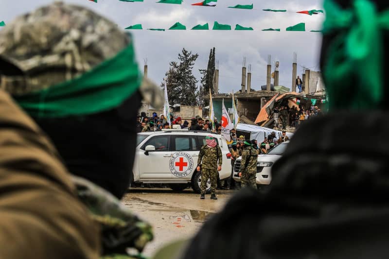 تبدأ ألوية القسام ، الجناح العسكري في حماس ، الحفل الذي يقومون خلاله بتسليم رهينات إسرائيلية تال شوههام وأيفرا مينيستو إلى اللجنة الدولية للصليب الأحمر (ICRC) كجزء من صفقة وقف إطلاق النار. عابد رحيم خاتيب/DPA