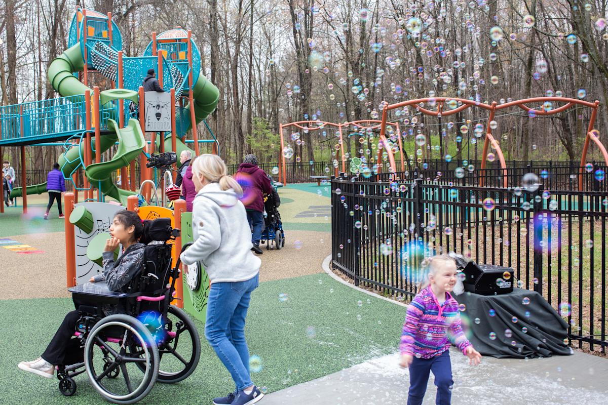 ركضت فتاة بفرح عبر فقاعات في تفاني الملعب الشامل في حديقة Blendon Woods Metro Park يوم الخميس.