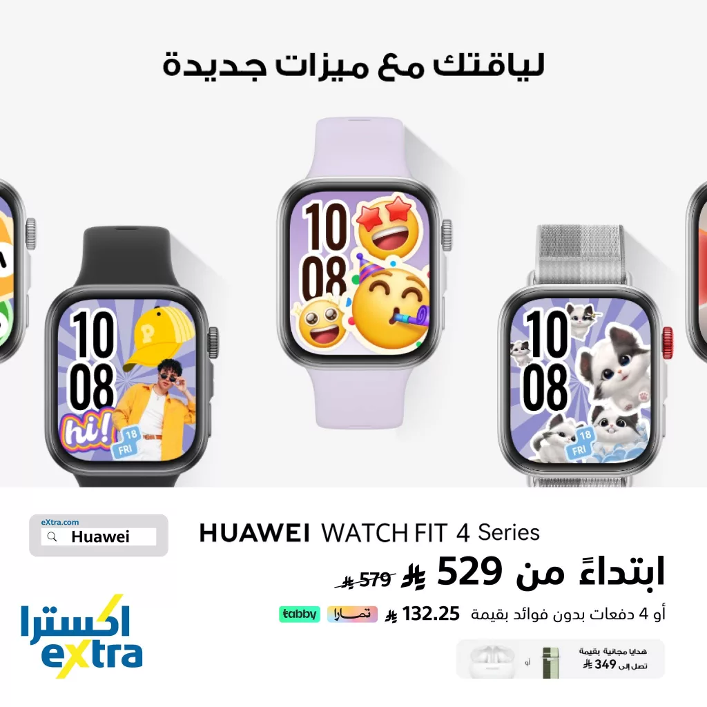 عروض اكسترا السعودية تقدم لك تجربة جديدة من الأناقة والتقنية مع ساعات HUAWEI WATCH FIT 4 Series التي تأتي بتصاميم مميزة تناسب جميع الأذواق حيث يمكنك اختيار واجهات مرحة مثل الحيوانات الأليفة أو الإيموجي لتضفي طابعا شخصيا على ساعتك الذكية وتستمتع بتجربة فريدة مليئة بالحيوية والمرح