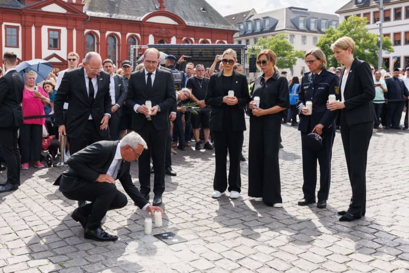 وزير الألماني للألكساندر دوبرينت يركع أمام اللوحة التذكارية خلال الخدمة التذكارية للاحتفال بالذكرى السنوية الأولى للهجوم المميت على رئيس الشرطة المفتش روفين لور. لاندو هاس/DPA