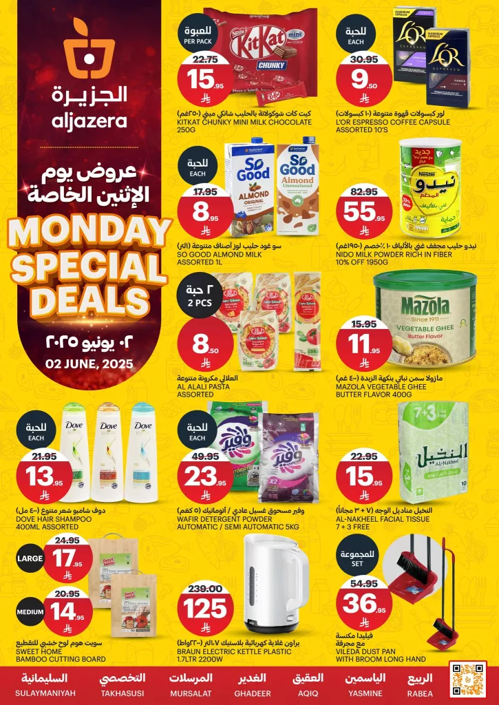 عروض أسواق الجزيرة الاثنين 2-6-2025 تشمل تشكيلة متنوعة من المنتجات الغذائية والمنزلية التي تلبي احتياجات الأسرة اليومية حيث توفر تشكيلة واسعة من المواد الأساسية مثل الحليب النباتي والمكرونة والشوكولاتة إضافة إلى المنظفات والشامبو ومناديل الوجه كما تتوفر عروض مميزة على الأجهزة المنزلية