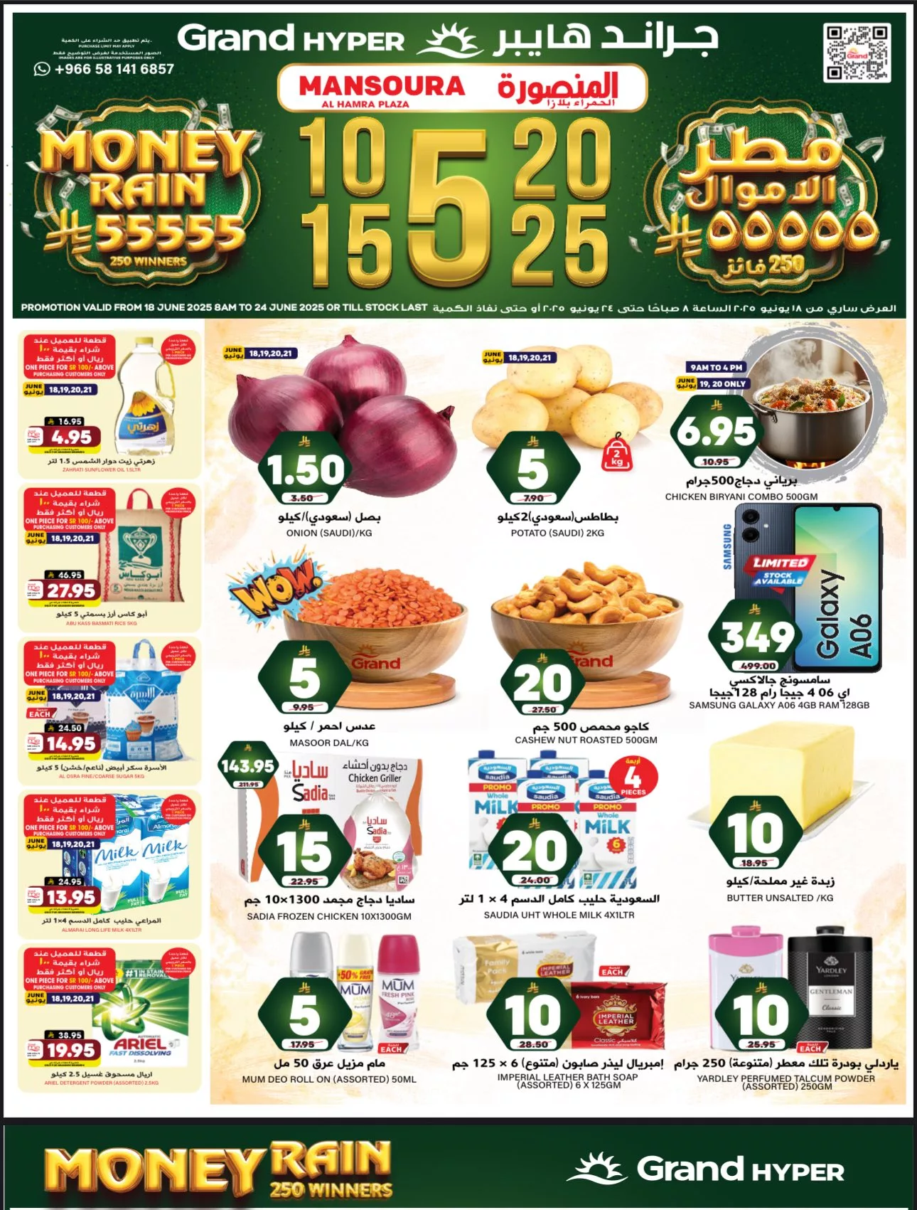 عروض جراند هايبر الرياض الأربعاء 18 يونيو 2025 بدأت بعروض غنية على السلع الاستهلاكية مثل مناديل المطبخ والصابون المضاد للبكتيريا ومنظفات الملابس ومعطرات الجو بالإضافة إلى الحليب طويل الأجل ومنتجات الشوفان والعسل الطبيعي ومعلبات الخضروات الجاهزة مثل الفاصوليا والبازلاء والذرة
