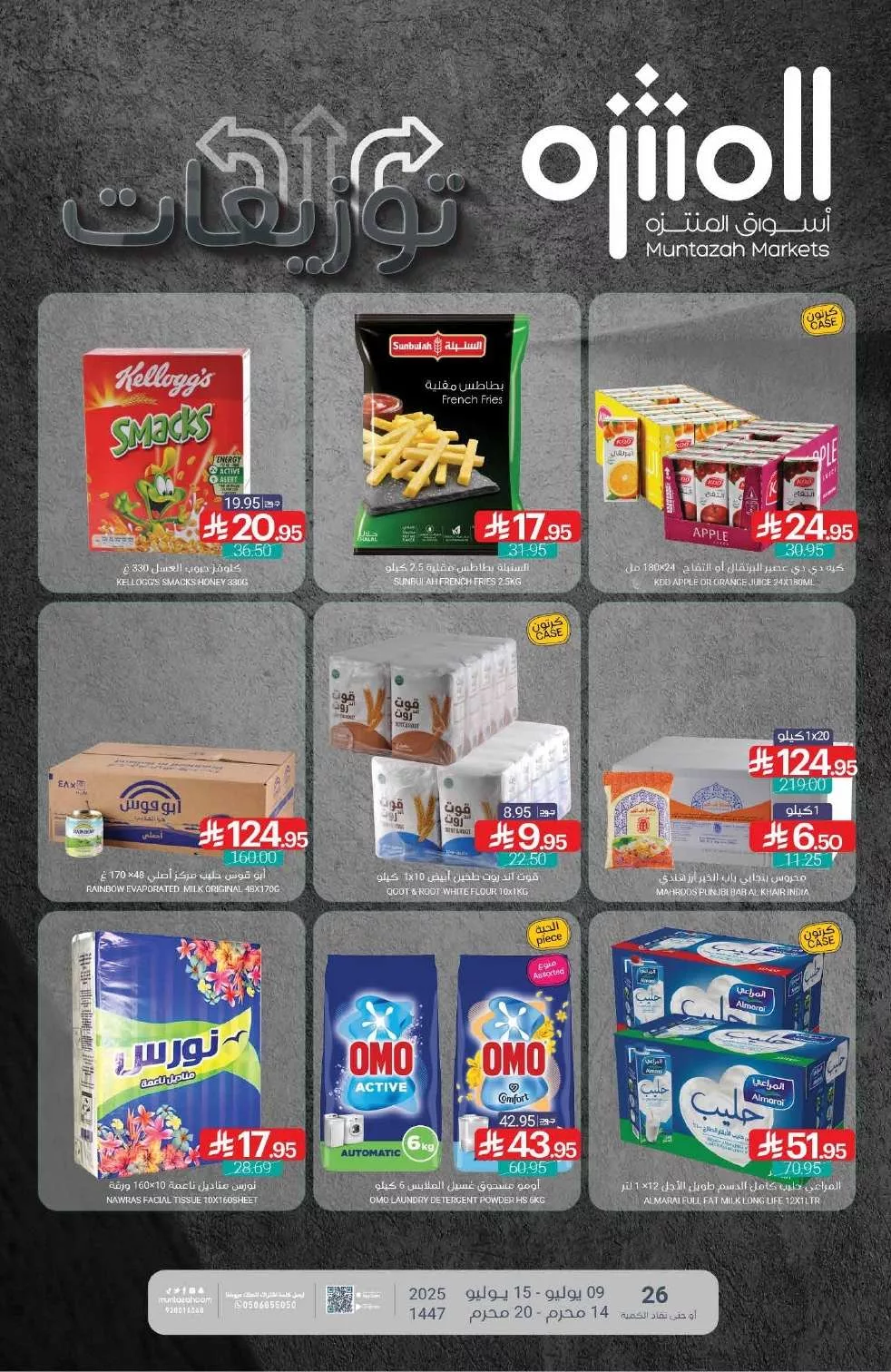 عروض أسواق المنتزه الأسبوعية الأربعاء 14 محرم 1447هـ تنطلق بتخفيضات رائعة على المواد الغذائية اليومية التي تشمل حبوب الإفطار بأنواعها المختلفة والزيت النباتي والسكر والأرز بالإضافة إلى الشوربة الفورية والمعلبات الجاهزة مثل الفول والحمص والتونة مع بهارات مخصصة للطبخ الخليجي والمربي بنكهات موسمية