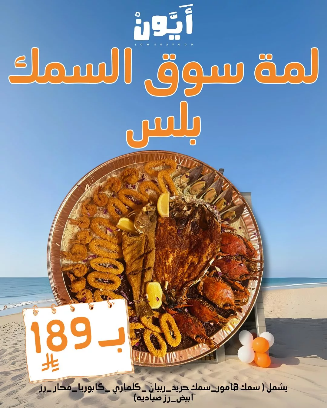 وجبة غنية بالنكهات البحرية تشمل قطع روبيان، كابوريا، وكاليماري الطازج، تُقدم مع شرائح الليمون وخبز محمص مقرمش داخل عبوة أنيقة مكتوب عليها شعار “أيون” وتقدم بسعر مميز جدًا ٩ ريال سعودي فقط