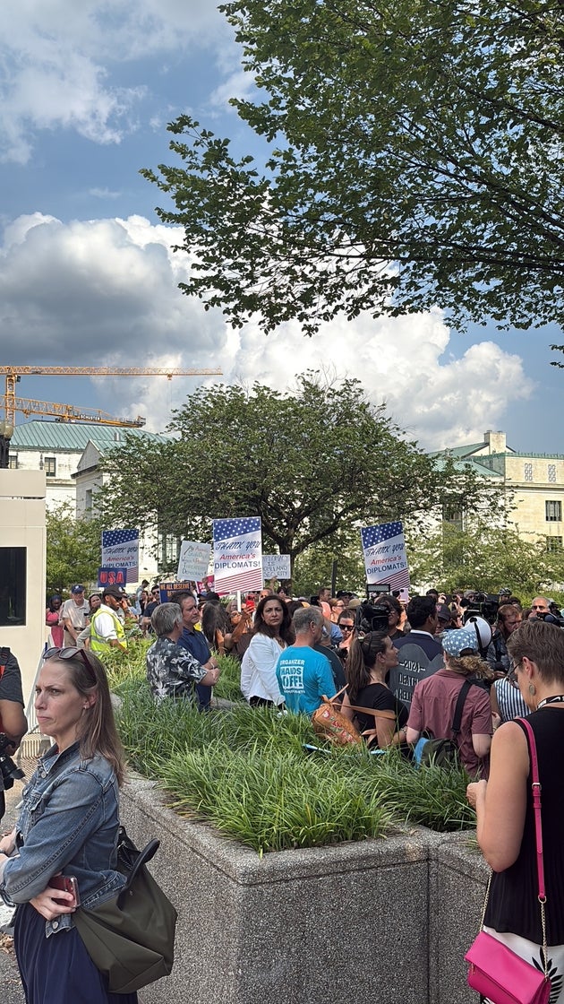 قاد المتحدثون في التجمع الهتافات إلى “القتال” وأخبروا موظفي وزارة الخارجية السابقين أنهم يجب أن يتحدثوا لأنهم لم يعودوا خاضعين لقيود الحكومة.