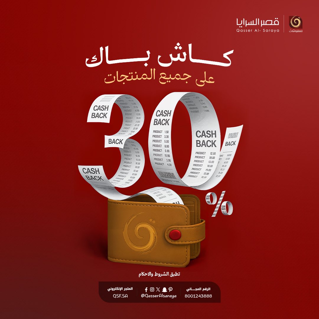 عرض الكاش باك 30% من قصر السرايا يمنحك فرصة استرداد 30% من قيمة مشترياتك، ليعود لك جزء من استثمارك في المفروشات الراقية على شكل خصم أو رصيد مستقبلي، مما يجعل تجربة الشراء أكثر جدوى وذكاء