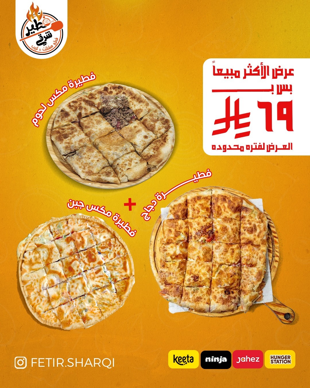 يقدم مطعم فطير شرقي في المدينة المنورة عرضا قويا على أشهر الأصناف وأكثرها طلبا بسعر مذهل فقط 69 ريال ولمدة محدودة هذا العرض الرائع من فطير شرقي يشمل تشكيلات فطائر غنية بنكهاتها وتنوعها ما بين اللحوم والدجاج والأجبان ويمكنك الحصول عليه بكل سهولة من خلال الطلب عبر أشهر تطبيقات التوصيل مثل جاهز ونينجا وهونغر ستيشن وكيتا أو زيارة فرعهم في المدينة المنورة، شارع الأمير محمد بن عبدالعزيز، حي الإسكان.