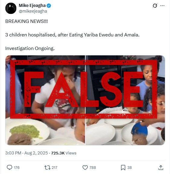 في نيجيريا ، تدور المساحات عبر الإنترنت مع الإهانات العرقية التي يتم تداولها بين يوروبا والإيبو – وقد ساء ذلك منذ انتخابات 2023 المتوترة التي تضمنت مرشحين رئاسيين من هذه الأعراق. تدعي الوظائف الحديثة على X أنها تظهر صورًا لثلاثة أطفال نيجيريين في المستشفى بعد تناول طبق يوروبا الشهير. لكن الادعاء كاذب. الصور عبارة عن لقطات شاشة من مقطع فيديو منشئ المحتوى الذي أعدته لعائلتها.
