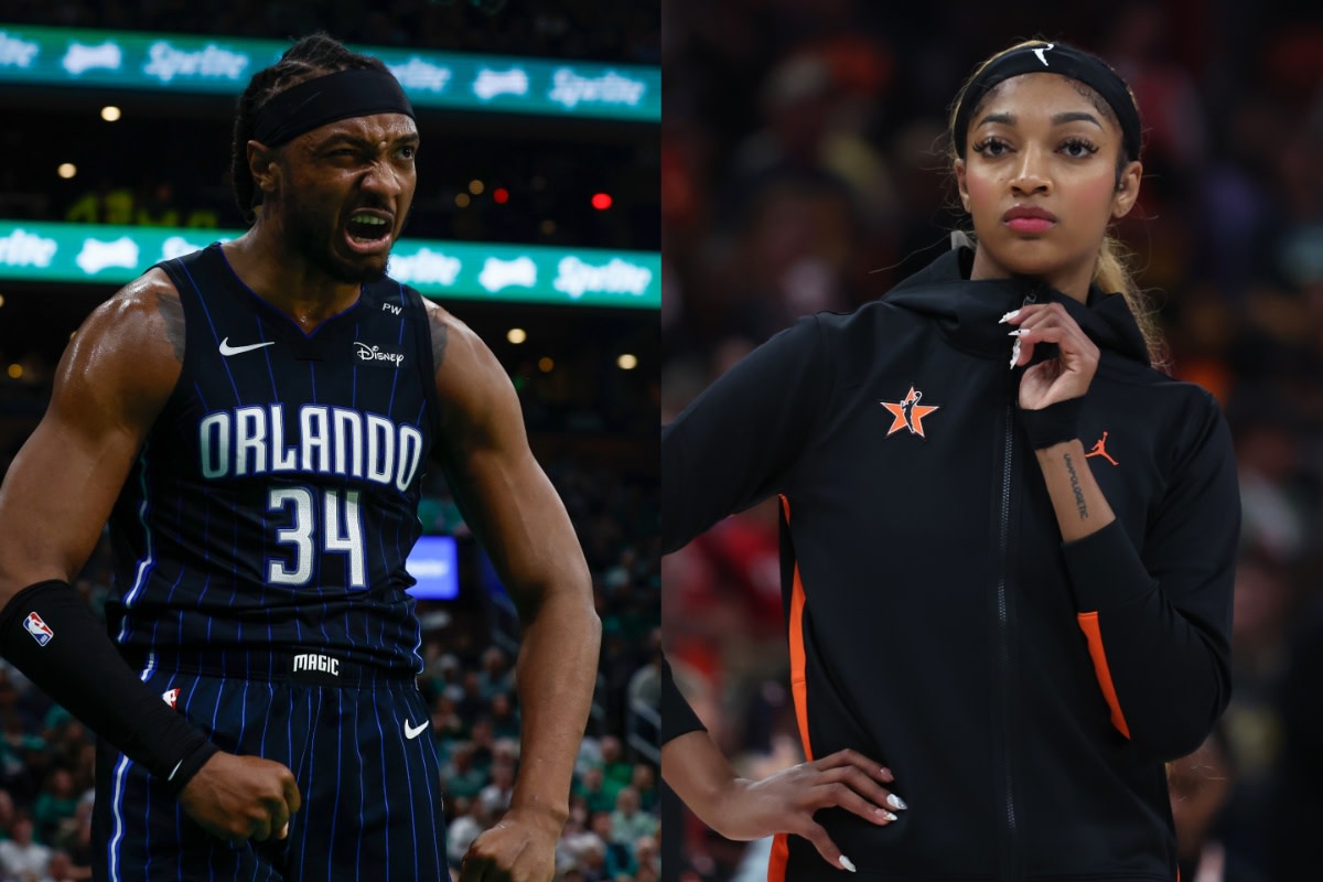 أشعلت أورلاندو ماجيك بيج مان ويندل كارتر جونيور ونجمة شيكاغو سكاي أنجيل ريس تكهنات المواعدة خلال لعبة WNBA All-Star. صور Winslow Townson-Imagn