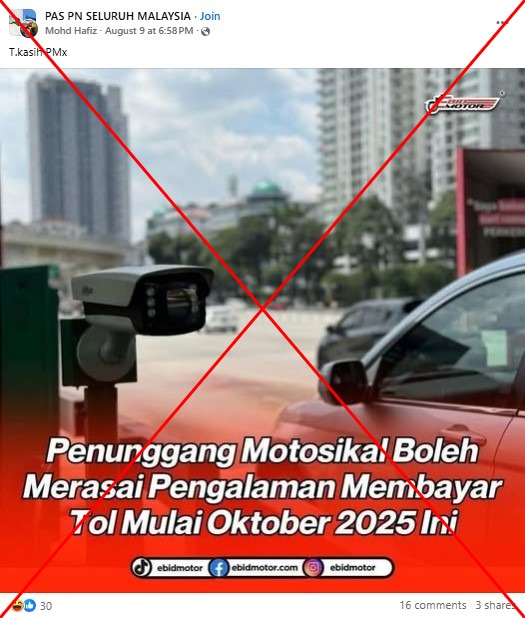 تمت مشاركة نفس الرسم حول الرسوم المزعومة لراكبي الدراجات النارية عبر Facebook و Instagram و Tiktok ، حيث بدأت ماليزيا في اختبار نظام Tolling جديد يستخدم “التعرف على لوحات الأرقام التلقائية (ANPR)” لتخفيف حركة المرور على الطرق السريعة في البلاد ، مع تنفيذ أوسع في جميع أنحاء البلاد في أكتوبر (رابط مؤشر).