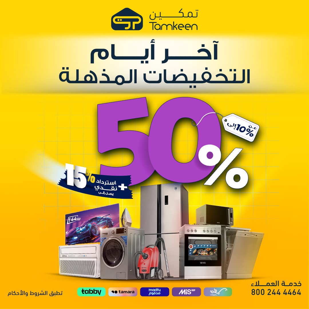 تقدم معارض تمكين حملة التخفيضات المذهلة حتى 50% على مجموعة واسعة من الأجهزة الكهربائية الحديثة من ماركات عالمية وكبيرة يمكنكم الاستفادة من خصومات كبيرة لا تتكرر لا تفوتوا اخر ايام التخفيضات المذهلة من تمكين و اغتنموا فرصه العرض.