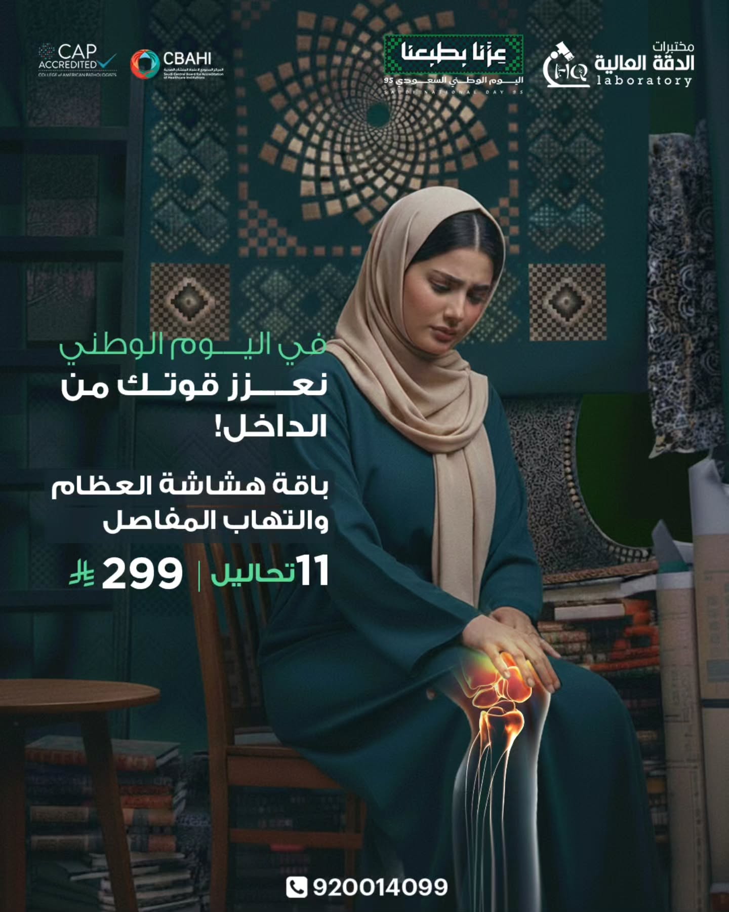 عروض مختبرات الدقة العالية تقدم تخفيضات قويه بمناسبة اليوم الوطني السعودي وفرصة مميزه للعناية بالصحة من الداخل عبر باقة متكاملة تضم ١١ تحليل مهم يخص العظام والمفاصل كل هذا بسعر منافس ٢٩٩ ريال (غير شامل الضريبة) لا تفوتوا هذه العروض المميزه