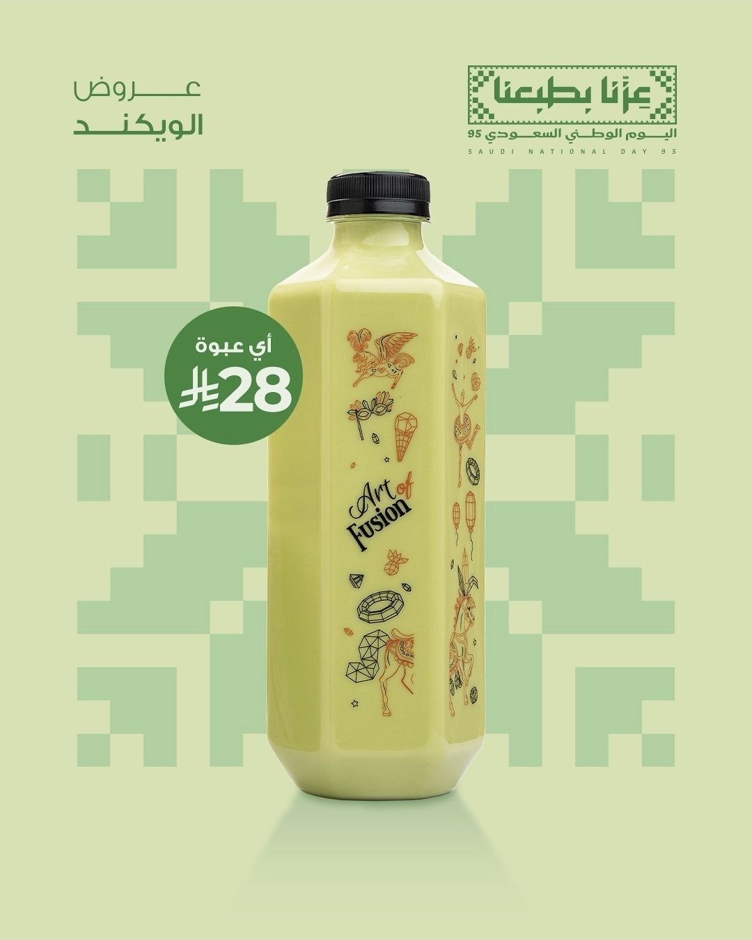 استمتعوا بالعصائر الطازجة بنكهاتها الفريدة مع تصميمات مميزة للعبوات والكاسات تعكس أجواء الاحتفال وروح اليوم الوطني. تجربة منعشة تضيف لمسة جميلة ليومكم وتكمل فرحة المناسبة.