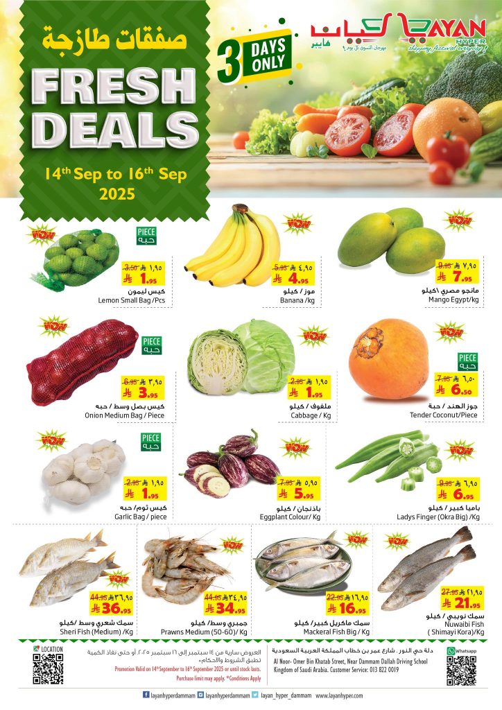 عروض ليان هايبر ماركت الاحد 14 سبتمبر 2025 تقدم مجموعة واسعة من المنتجات الطازجة حيث تشمل الفواكه مثل الموز والمانجو المصري والليمون و تشمل أيضا تشكيلة مميزة من الأسماك الطازجة والبحريات التي تضيف تنوعا رائعا لمائدة الأسرة حيث تتوفر أصناف مثل السمك الماكريل والسمك الشعري والسمك النواهي باقل الاسعار