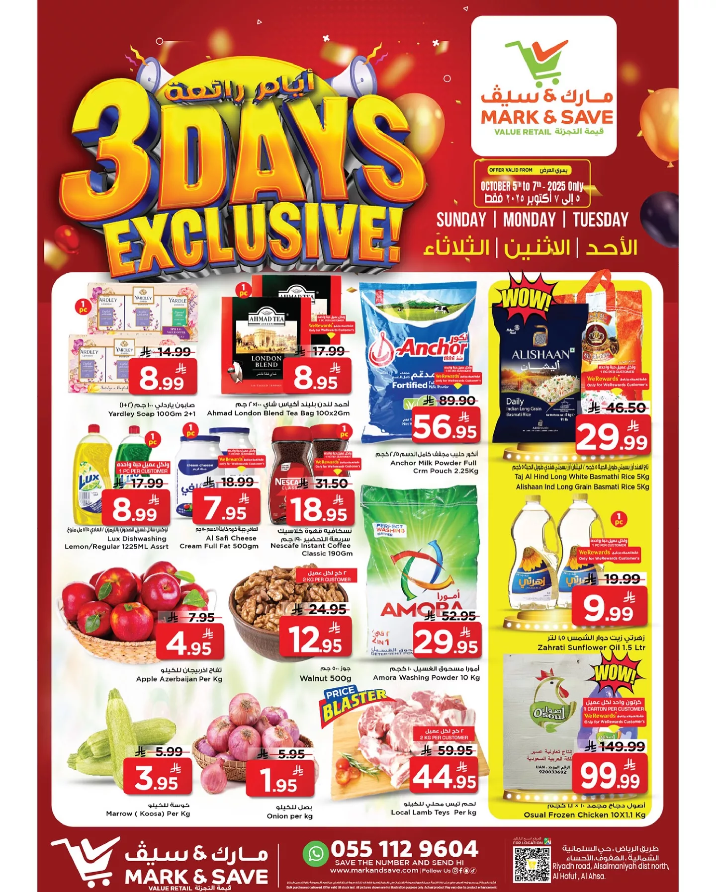 عروض مارك اند سيف الاحساء السبت 4 اكتوبر 2025 تقدم تشكيلة مميزة من المنتجات الطازجة تشمل الفواكه بالإضافة إلى الخضروات المتنوعة مثل الكوسة والباذنجان والملفوف والليمون وغيرها و تتضمن أيضا تخفيضات على اللحوم الطازجة بأنواعها والدواجن ومجموعة مختارة من المنتجات المجمدة بالإضافة إلى أدوات المطبخ