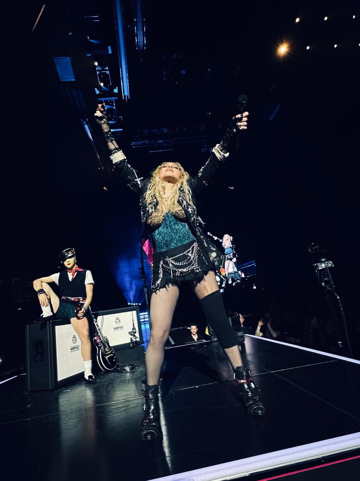 لا تحتاج مادونا إلى أن تكون هناك، وركبتها اليسرى المتزعزعة مغلفة بأكمام، وتتأرجح فوق الكراسي وتقفز عبر أغنية “افتح قلبك” المتلألئة مع مجموعتها الرشيقة من الراقصين أو تنزلق فوق الجمهور في صندوق زجاجي لتغني، تمامًا بقوة، “عش لتخبر” الجميل.