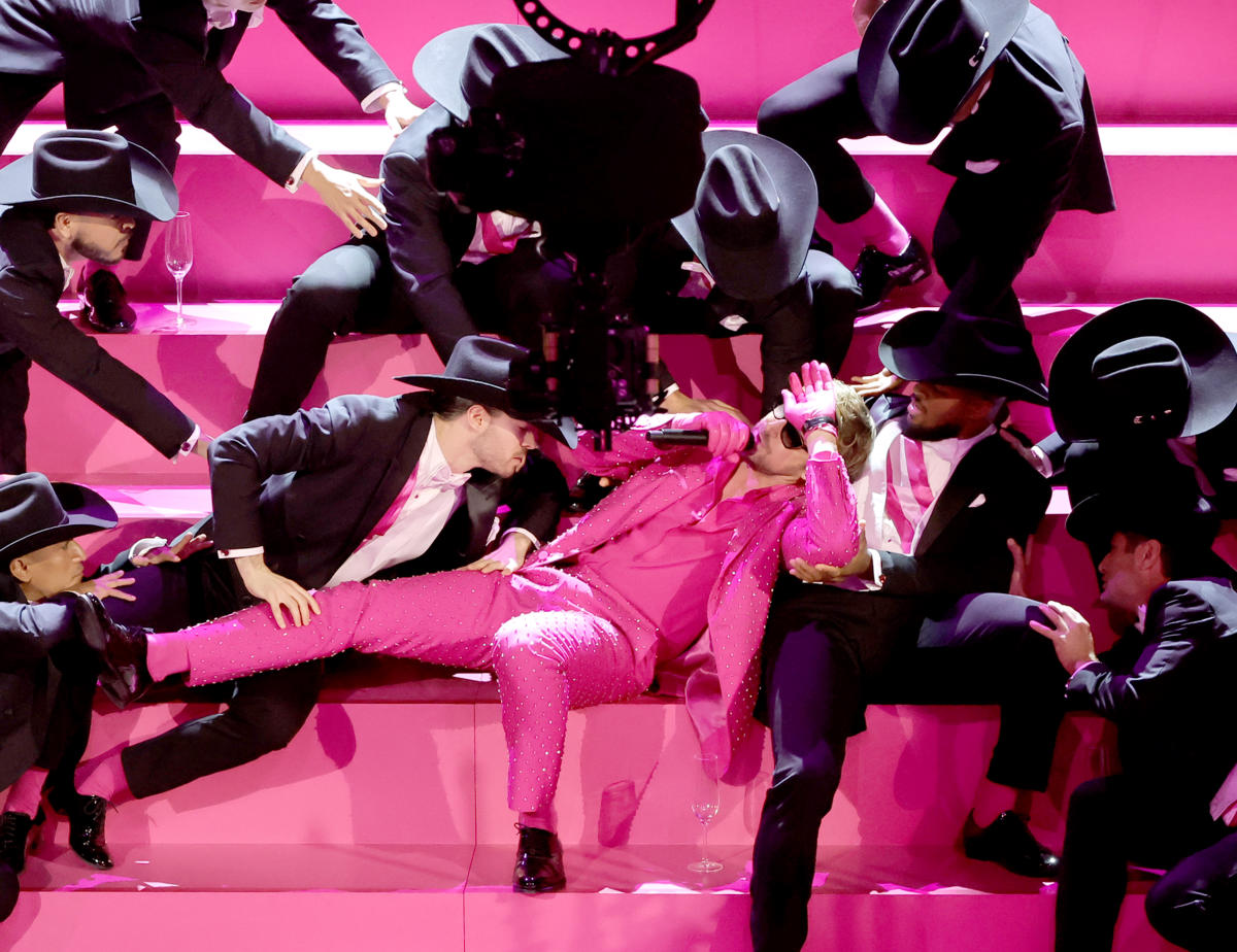 كان يرتدي بدلة وردية اللون وقفازات فيما يبدو أنه تكريم لفيلم مارلين مونرو الكلاسيكي عام 1953. الرجل المحترم يفضل الشقراوات. وانضم جيش من أفراد عائلة كين الآخرين إلى جوسلينج على خشبة المسرح، كما فعلت المخرجة جريتا جيرويج، والنجمتان المشاركتان أمريكا فيريرا ومارجوت روبي، وحتى سلاش.