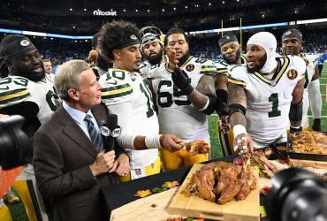 لاعب مبتدئ من شركة Packers يشارك اللوحة مع فريق Ford Field Security في لحظة ممتعة
