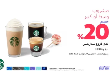 خصم 20% على المشروب الكبير والوسط من ستاربكس عند استخدامك بطاقات الراجحي