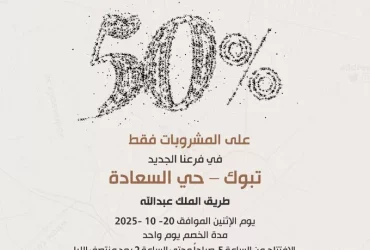 خصم 50% من عنوان القهوه بمناسبة افتتاح فرع تبوك- حي السعادة طريق الملك عبدالله