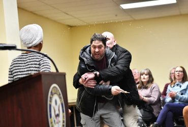 رجل يندفع نحو النائبة إلهان عمر أثناء انعقاد مجلس المدينة ويحاول رشها بمادة غير معروفة