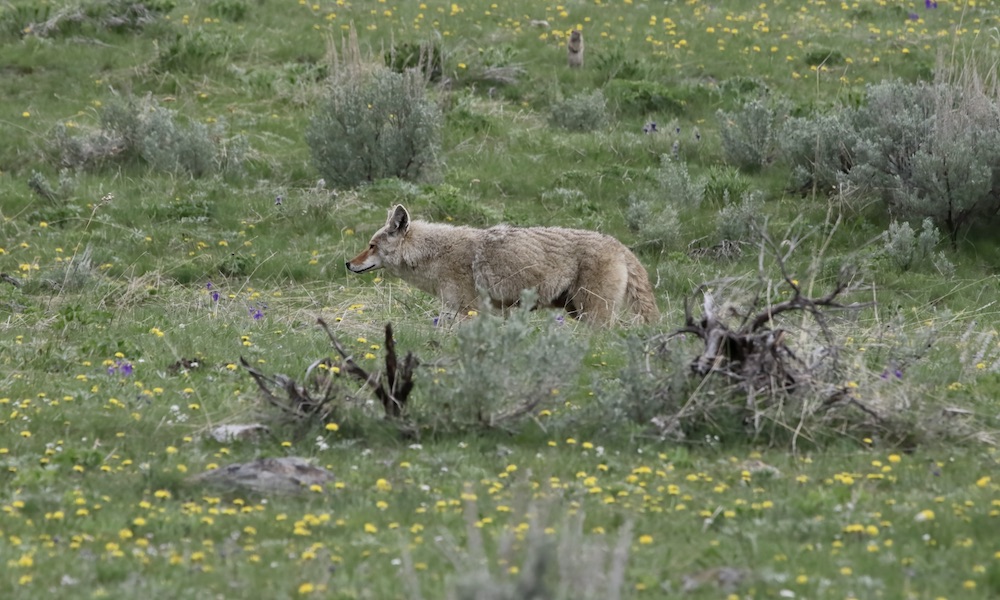 سوف يلاحظ المشاهدون عبور الذئب عبر مرج مورق مليء بالزهور البرية بجانب الطريق السريع في النطاق الشمالي.
