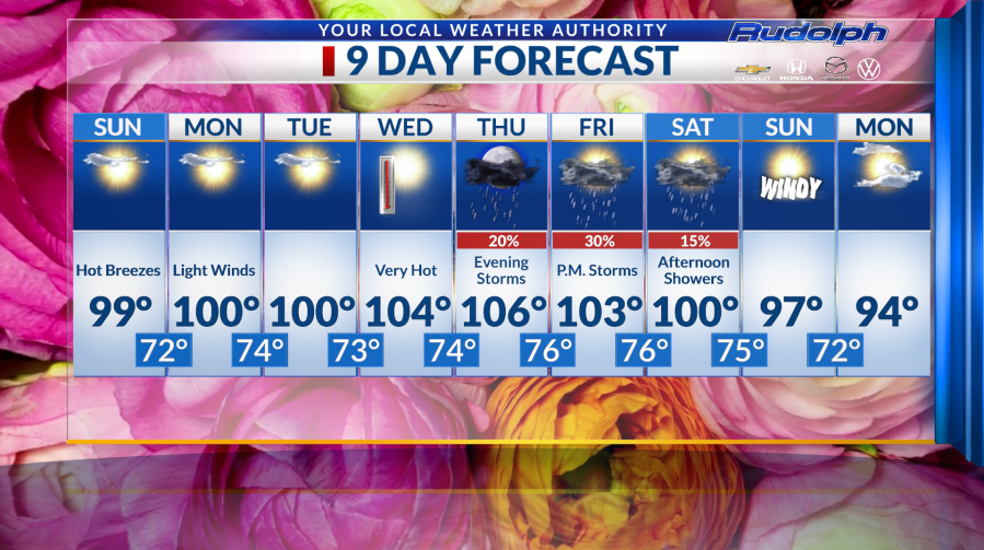 الخميس هو عندما تبدأ الأمور في التحول. من المتوقع أن تصل درجة الحرارة القصوى خلال اليوم إلى 106 درجة مصحوبة باحتمال 20 بالمائة لحدوث عواصف مسائية.