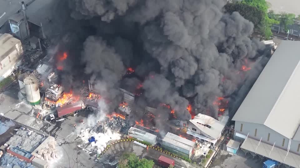 القصة: :: يظهر مقطع فيديو بطائرة بدون طيار النار والدخان يبتلع مصنع زيت الطهي في جاوة الغربية، إندونيسيا