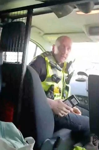 شرطي ينظر إلى الراكب من مقعد الشرطة الأمامي