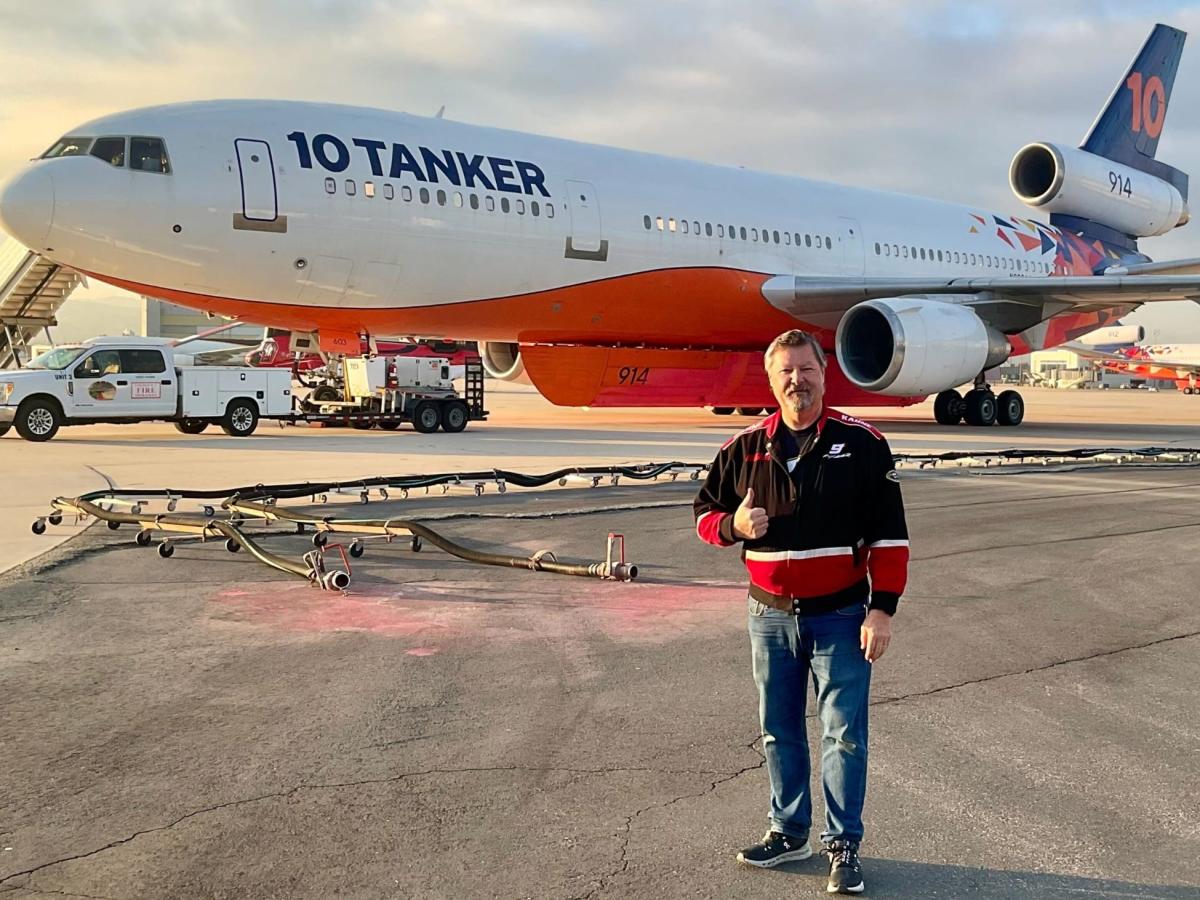 الكابتن آر كيه سميثلي يقود قاذفات الإطفاء ماكدونيل دوغلاس دي سي-10 لشركة 10تانكر ومقرها نيو مكسيكو.