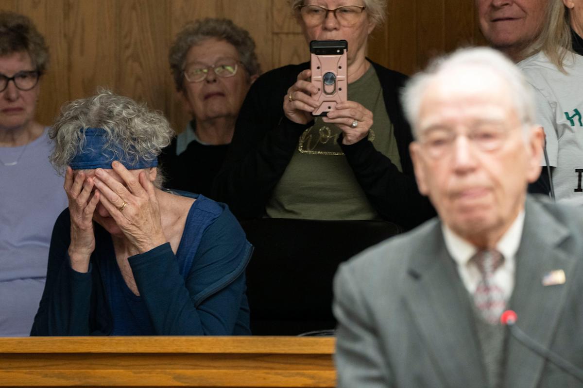 يتفاعل المكون مع السناتور الأمريكي تشاك جراسلي خلال قاعة بلدية في محكمة مقاطعة فرانكلين يوم الجمعة 21 مارس 2025 ، في هامبتون.