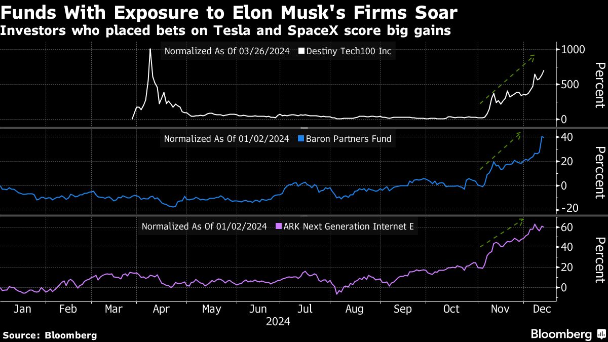 من بين أولئك الذين نجحوا في تصفح تجارة ماسك، صندوق Destiny Tech100 Inc.، الذي ارتفع بأكثر من 500٪ منذ انتخابات 5 نوفمبر. يستثمر الصندوق في أسهم الشركات الناشئة في السوق الخاصة، وأظهر أحدث إيداع له أن أكثر من ثلث ممتلكاته كان عبارة عن رهان على SpaceX في نهاية سبتمبر. أدى فوز ترامب إلى اندفاع المستثمرين الأفراد إلى الصندوق، مما رفع أسهمه إلى علاوة مذهلة مقارنة بقيمة أصوله الأساسية.