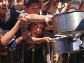 ولوح المتظاهرون الآخرون بالأعلام الفلسطينية بينما كان يرتدي الأوشحة Keffiyeh ، وهموا “فلسطين حرة” والتعبير عن التضامن مع الفلسطينيين الذين قتلوا في حرب إسرائيل في غزة.