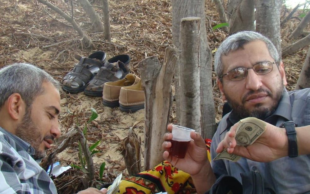 تظهر الصورة محمد ضيف، قائد كتائب عز الدين القسام التابعة للجماعة الإرهابية، يتفقد ساعته بشكل عرضي وهو يمسك بكوب بلاستيكي نصف مملوء بيد واحدة ومجموعة من الأوراق النقدية بالدولار الأمريكي في اليد الأخرى.