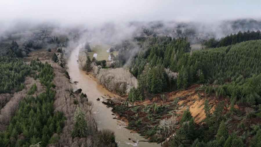 حدث انهيار أرضي بالقرب من نهر سيليتس، مما أدى إلى تدمير جزء من OR 229 وأثر على المنازل المجاورة. 12 ديسمبر 2025 (بإذن من وزارة النقل في ولاية أوريغون).